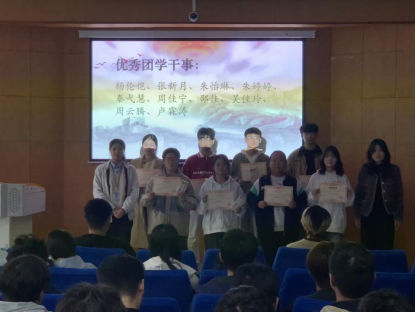 随后进入优秀团学干部与优秀干事表彰环节,部分学生凭借在团学工作中的突出表现荣获“优秀团学干部”称号与“优秀团学干事”称号。获奖代表们依次上台。李明明老师、团总支副书记王宝文、学生会主席贺诗茵依次为获奖代表们颁奖,并进行拍照合影留念。获奖代表们手持荣誉证书,脸上洋溢着自豪的笑容,这既是对他们过去工作的肯定,也是对他们未来继续奋进的鞭策。