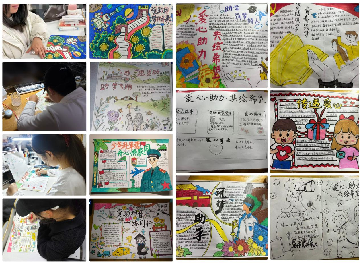 面向全院学子发起“资助筑梦・青春同行”创意作品征集活动,以手抄报为主要载体,鼓励学生自主学习政策、自主设计创作,将助学贷款办理流程、入伍资助福利亮点等核心内容转化为图文并茂、生动鲜活的艺术作品。优秀作品在校园宣传栏集中展示,以展促宣、以创传知,让资助理念在自主学习与广泛传播中深入人心。