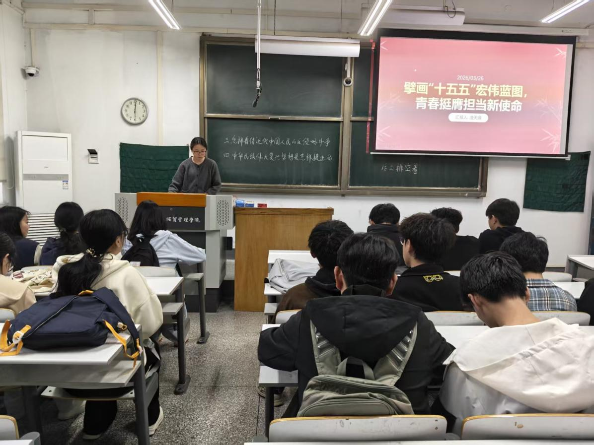 本次活动以“擘画‘十五五’宏伟蓝图,青春挺膺担当新使命”为主题,采用“知识导入+案例警示+实践承诺”模式开展。活动伊始,全体学生起立奏唱团歌。随后,团支部负责人带领学生学习“十五五”规划核心部署,解读发展新质生产力等关键内容,播放青年建功典型案例视频,强化理论认知。活动中,全体学生签署“青春助力‘十五五’”承诺书,明确学业与实践目标。最后,负责人做总结发言,鼓励学生以实际行动践行青年担当。
